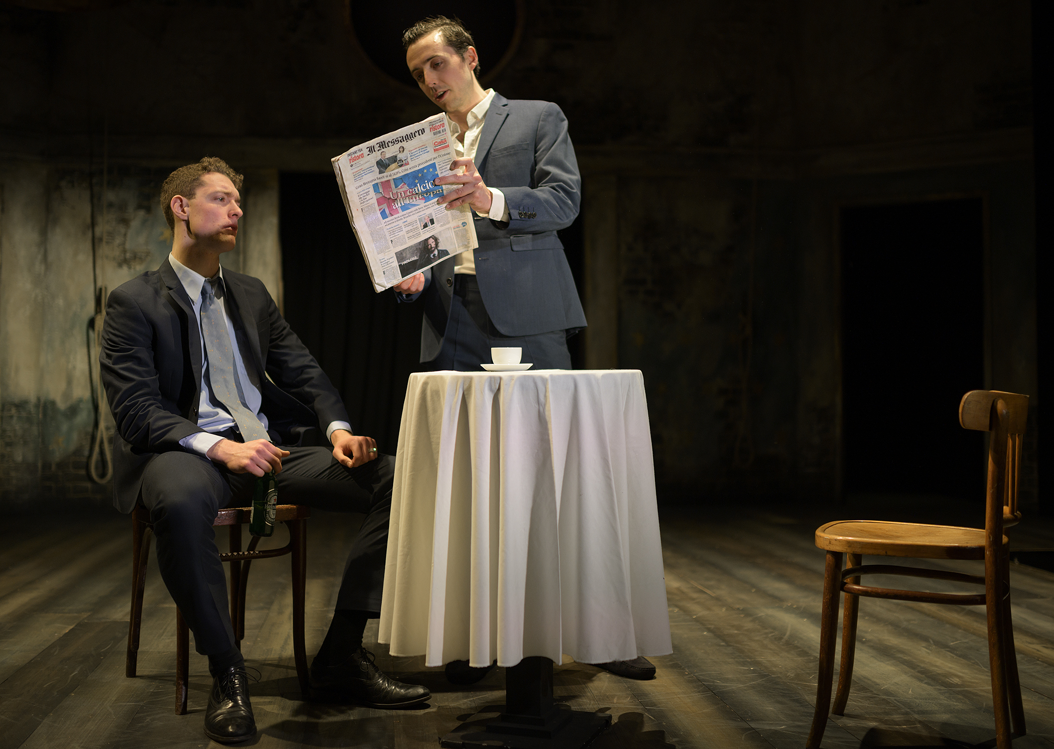 “I do believe, statist though I am none, nor like to be, that this will prove a war.” Posthumus (Adam Goodbody), Philario (Peter Ferneding). Photo by Patrick Baldwin
